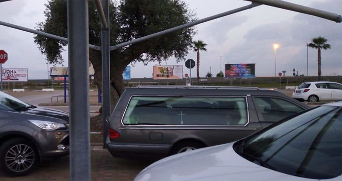 Un carro funebre con bara a bordo, parcheggiato nel centro commerciale “Le Colonne” di Brindisi. Il conducente e il suo accompagnatore hanno parcheggiato regolarmente negli stalli riservati al pubblico e sono entrati, probabilmente per effettuare spese urgenti. La presenza, un po’ inquietante, del carro funebre con la cassa da morto all’interno e corona di fiori ha suscitato ovviamente la curiosità di molte persone.