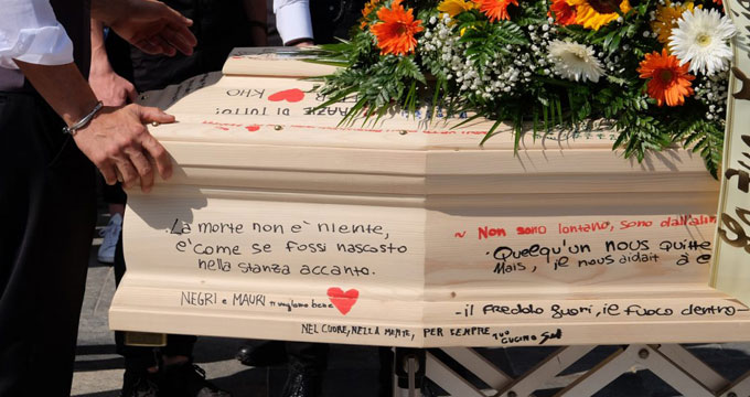 Il legno chiaro della bara come la pagina di un diario, riempito di frasi scritte con i pennarelli.