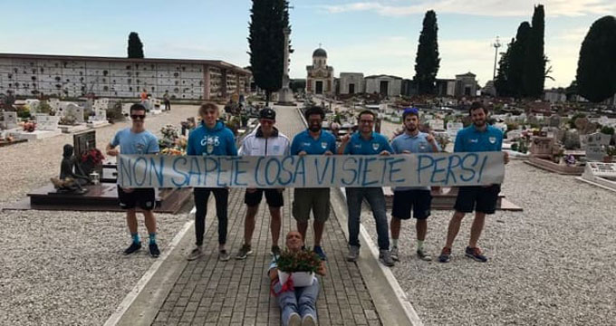 Per festeggiare la vittoria nel palio del Vecchio Mercato di Montebelluna, conquistata domenica scorsa, i componenti della squadra della Pieve hanno pensato bene di festeggiare con una foto tra il goliardico e il grottesco: si sono fatti immortalare, al cimitero, con uno striscione con su scritto “Cosa vi siete persi“. La reazione a quell’immagine che rapidamente è diventata virale su Facebook è stata di sdegno e di rabbia. Non potevano certo immaginare che la trovata scatenasse un vespaio, ma così fatalmente è stato.