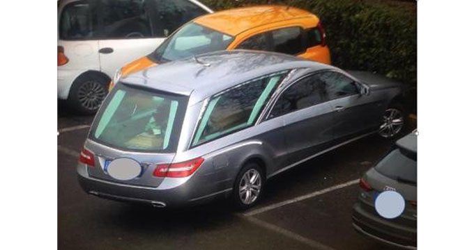 Serravalle Scrivia. Carro funebre (con bara) in sosta all’outlet.