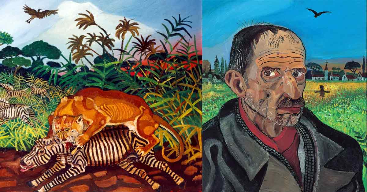 Ligabue dipinge tigri, leoni, galli, cervi, scene di caccia e autoritratti inquieti.