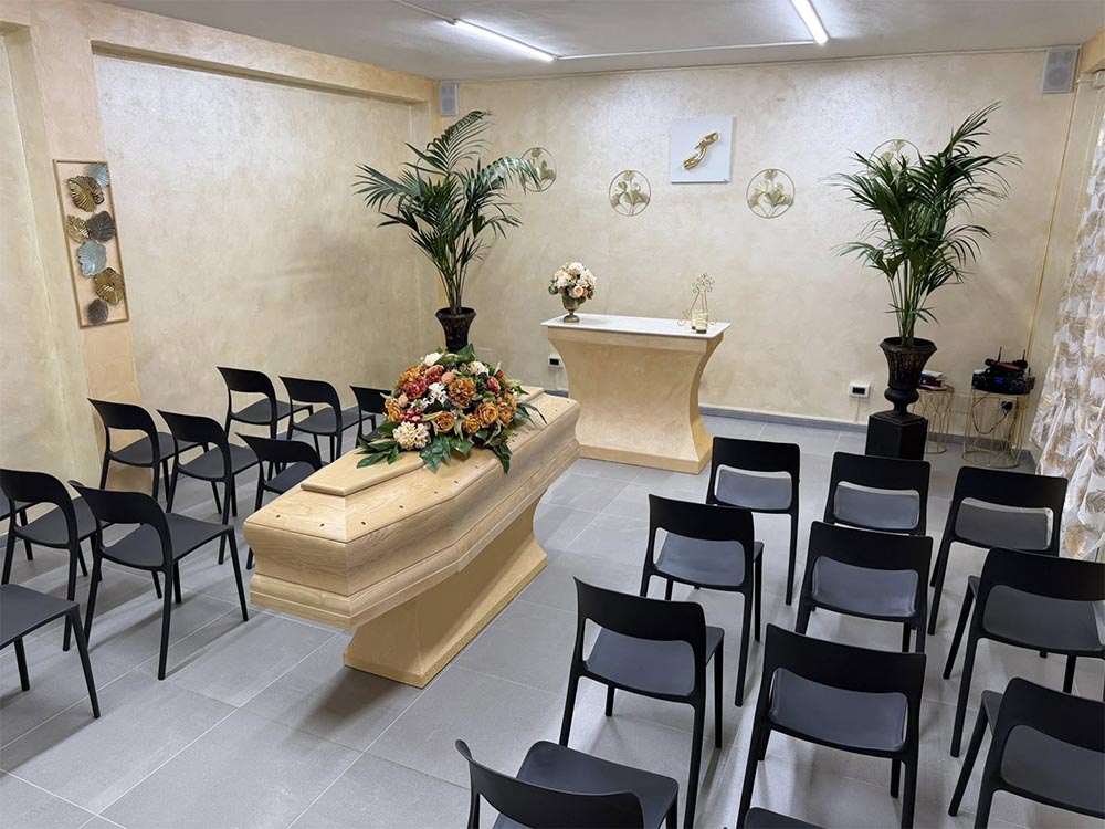 Gli spazi interni sono ampi e funzionali, pensati per permettere lo svolgimento della veglia funebre e dell’ultimo saluto in modo ordinato e rispettoso.
