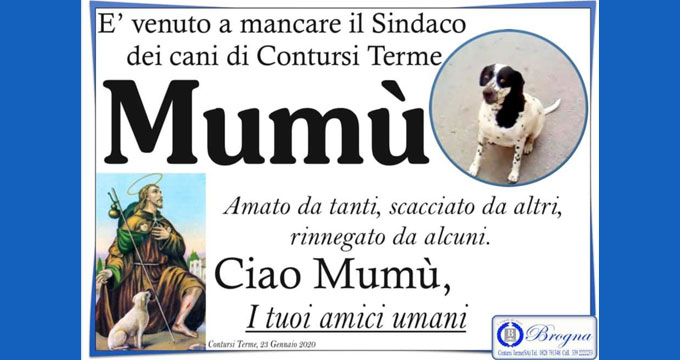 A Contursi Terme, nel Salernitano, è apparso un manifesto funebre che sta commuovendo molti e sta facendo il giro del web. E’ deceduto Mumù, un randagio adottato 15 anni fa dal Comune e per questo diventato noto come il “sindaco dei cani”, e i suoi concittadini lo hanno voluto ricordare in modo speciale. “È venuto a mancare Mumù, il sindaco dei cani del Comune di Contursi Terme. Amato da tanti, scacciato da altri e rinnegato da alcuni. Ciao Mumù. I tuoi amici umani”, si legge sull’annuncio.