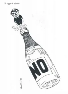 Una bottiglia di spumante con l’etichetta “No” che esplode lanciando un tappo dalle fattezze di Amintore Fanfani.