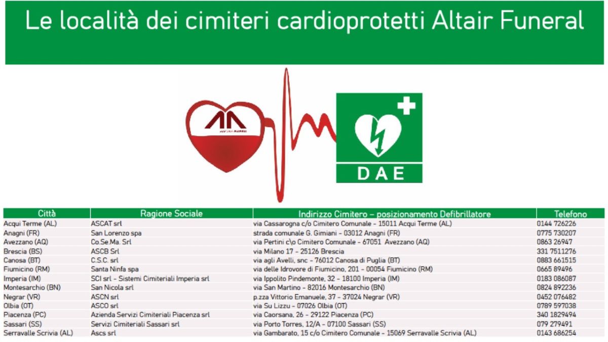 Altair Funeral promuove il progetto “Cimiteri Cardio Protetti”: nuovi defibrillatori in 32 città italiane.