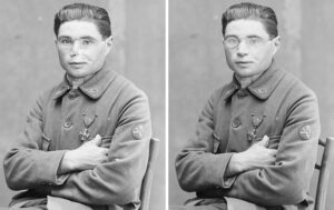 Studia con attenzione il volto deturpato e lo confronta con le foto pre-belliche.