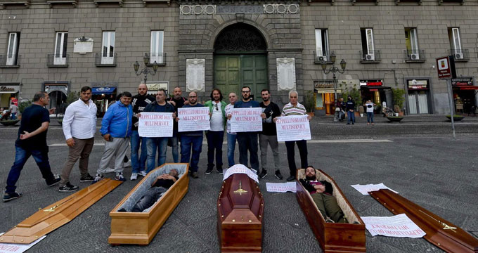 Bare e morti finti davanti al Municipio. Napoli, la tetra protesta dei seppellitori.