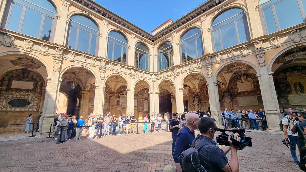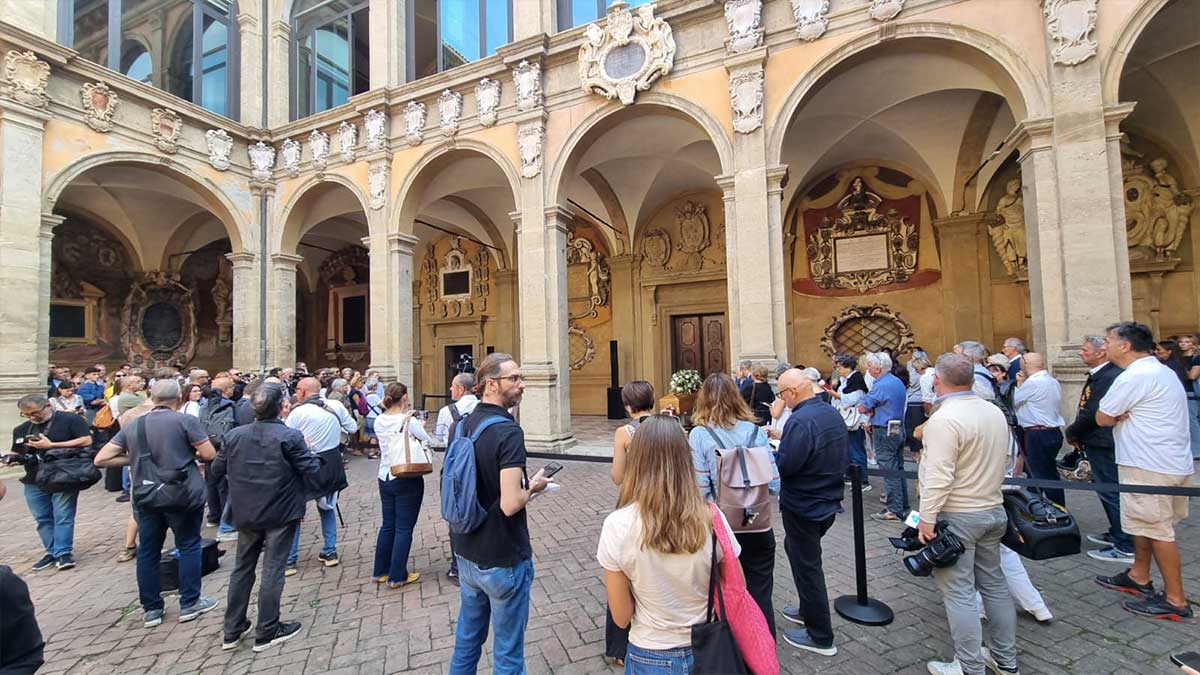 La camera ardente è stata allestita nel magnifico cortile dell’Archiginnasio, uno dei luoghi simbolo della cultura bolognese.