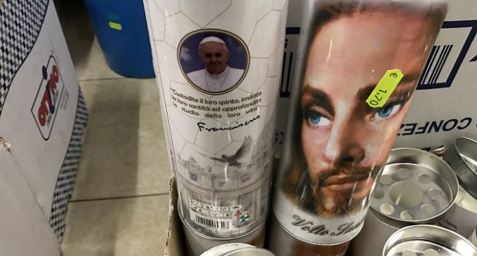 “Candela Bergoglio un euro e 70 centesimi. Ideale da mettere sulle lapide dei vostri defunti”. É solo una delle tante possibilità offerte dal mercato in vista della tradizionale commemorazione di tutti i defunti il 2 novembre prossimo. Quest’anno ovviamente l’offerta si è ampliata non solo col modello Papa Francesco, ma anche con versione di candele con il logo ufficiale del Giubileo straordinario della misericordia giunto quasi alla fine, insieme alle tradizionali immagini di san Giuseppe, la Madonna, il Volto Santo, san Pio da Pietrelcina, santa Teresa di Calcutta, sant’Antonio di Padova, san Giovanni XXIII e san Giovanni Paolo II. “Custodite il loro spirito, imitatene la loro santità e approfondite lo studio della loro vita”. É la frase di Bergoglio, chiaramente estrapolata da un’omelia per le canonizzazioni, che si legge sulla candela per i defunti che riporta la sua immagine.