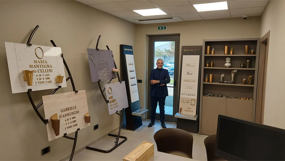 - Un’ampia showroom dedicata alla scelta di cofani funebri, urne cinerarie, bronzi e lapidi, con consulenti qualificati a disposizione delle famiglie.
