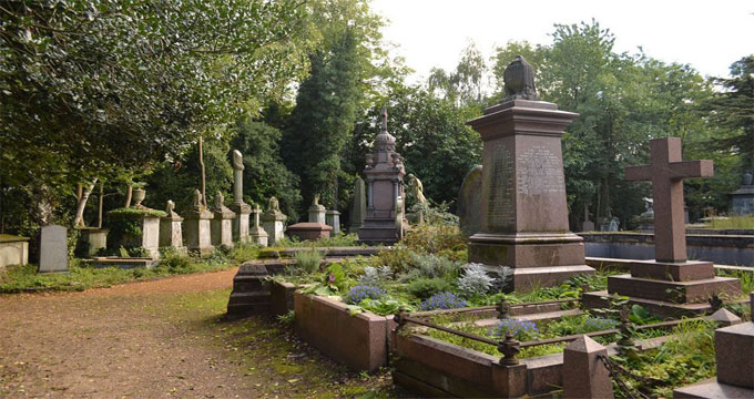 Il cimitero di Highgate fu aperto nel 1839, quando la capitale inglese, ormai praticamente priva di luoghi di sepoltura, decise di dotarsi dei “Magnificent Seven”, sette grandi cimiteri posti al di fuori dell’area abitata. Highgate è un cimitero dalla vegetazione lussureggiante e quasi completamente spontanea, dove riposano personaggi illustri, dal filosofo Karl Marx, alla scrittrice George Eliot, fino al cantante George Michael, scomparso da poco.