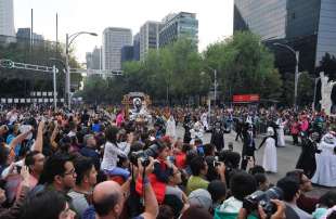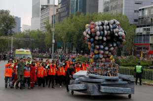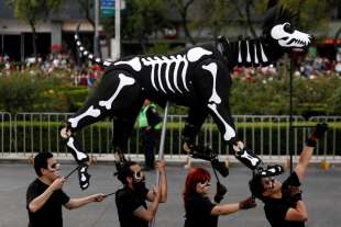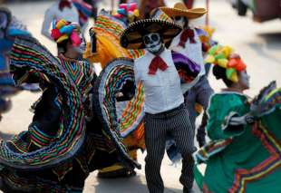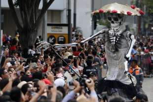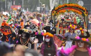 Migliaia di persone travestite da scheletri hanno sfilato per Città del Messico per il “Giorno dei Morti”. La parata quest’anno è stata dedicata alle 228 vittime del terremoto: tutti hanno camminato dietro un enorme pugno chiuso fatto di caschi e picconi. Il pugno era stato il segnale dei soccorsi per chiedere silenzio e per sentire se qualcuno era ancora vivo sotto le macerie. Trecentomila i partecipanti, 700 i performer, che hanno danzato e cantato canzoni messicane. Il colorato festival ogni anno celebra i cari che sono deceduti: in genere è un momento che si vive in famiglia, raccolti attorno alle tombe, ma per il secondo anno il festival si fa anche in grande, a Città del Messico, per attrarre più turisti.