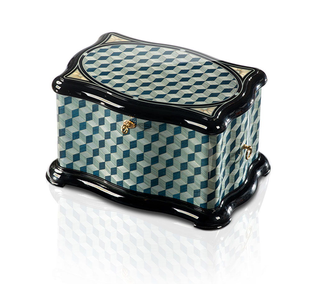 Cofano in Ebano Makassar con intarsio realizzato da 1.810 pezzi di giglio fiorentino in ottone dorato, 280 rombi in purissima madreperla bianca Shell Beads e tappezzeria interna in pelle primo fiore lavorata a capitonnè.