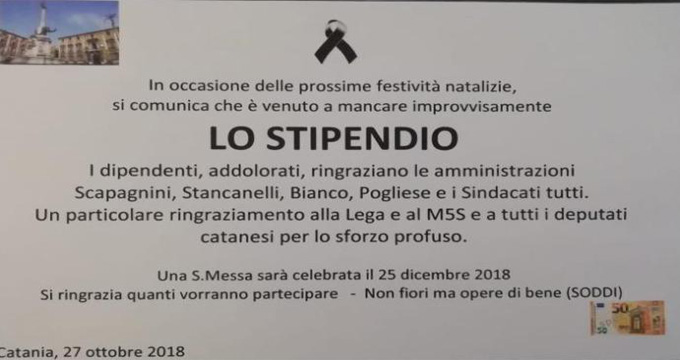 Eccola l’ironia catanese, quella che non ha eguali se non con i partenopei, tra i primi a inscenare anche funerali con tanto di ghirlande e necrologi per ironizzare sulla squadra di calcio sconfitta. Ma il catanese, forse più del napoletano, riesce a ironizzare anche sulle situazioni tristi, quelle buie. Ad avere sempre la battuta pronta anche negli episodi più truci…. Forse per smorzare la tensione. Così da giorni circola in città un manifesto sul dissesto con su scritto: “In occasione delle prossime festività, si comunica che è venuto a mancare lo stipendio”. Quindi il passaggio dedicato alle responsabilità politiche: “I dipendenti, addolorati, ringraziano le amministrazioni Scapagnini, Stancanelli, Bianco, Pogliese e i sindacati tutti. Un particolare ringraziamento alla Lega e al M5s e a tutti i deputati catanesi per lo sforzo profuso. Una messa sarà celebrata il 25 dicembre. Si ringrazia quanti vorranno partecipare. Non fiori ma opere di bene (soddi)”. Si tratta di un messaggio sintetico, ma che in sé racchiude tutti i segreti di questo disastro da un miliardo e mezzo di euro, soldi della città che in 20 anni si sono volatilizzati. Per le colpe delle amministrazioni. Per la mancata volontà di affrontare le riforme, di ridurre gli sprechi, di avviare una rigorosa lotta anti evasione. Nel “necrologio” ci sono anche le accuse ai sindacati, per alcuni colpevoli di non aver denunciato negli anni passati una situazione che si stava avvitando su sé stessa. E infine il dito accusatorio è rivolto anche verso la Lega e il M5s, probabilmente per le promesse mancate dei suoi due leader sul sostegno a Catania. Sotto accusa anche tutta la deputazione catanese che in questa difficilissima situazione si è eclissata.