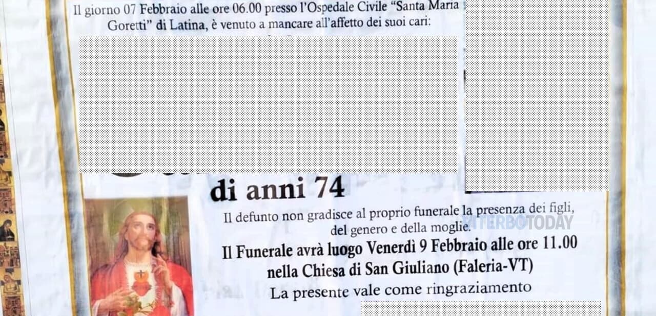 “Defunto esclude figli, genero e moglie dalla sua cerimonia funebre”. Questo è quanto è stato comunicato chiaramente attraverso il manifesto funebre di un uomo di 74 anni originario di Faleria, i cui funerali sono stati celebrati stamattina nella chiesa di San Giuliano.