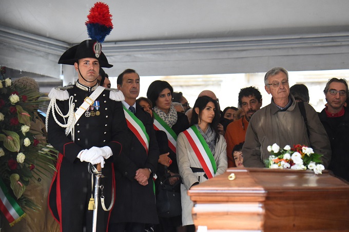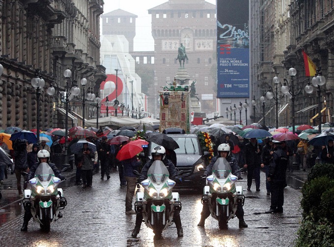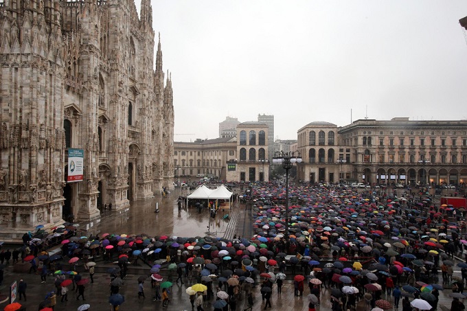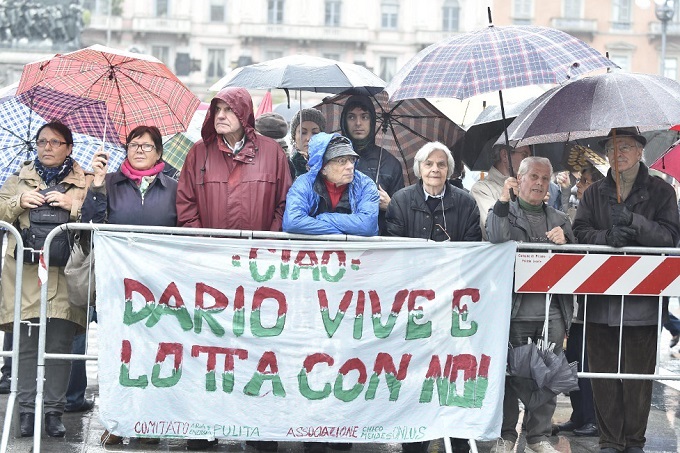 Duomo di Milano. La pioggia non ha fermato le migliaia di persone che hanno voluto essere presenti in piazza. Prima che iniziasse la cerimonia tra il pubblico hanno cominciato a scandire il suo nome: “Dario, Dario“. Le grida hanno preso corpo e sono state seguite da applausi; poi dagli altoparlanti è partita una delle canzoni di Fo, “Stringimi forte i polsi”.
