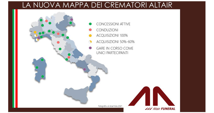 Con questa operazione Altair Funeral consolida la propria leadership nazionale nel settore delle cremazioni con 20 concessioni di impianti crematori distribuite in 8 Regioni italiane. In Piemonte sono oggi sei i crematori controllati da Altair Funeral con un numero di cremazioni nel 2021 che supererà i 23.000 servizi. Le strutture del Gruppo Altair del perimetro pre-acquisizione, su scala nazionale, chiuderanno invece l’anno corrente con più di 53.000 cremazioni complessive alle quali andranno sommati i servizi effettuati direttamente, in qualità di conduttore, a seguito degli affidamenti di Como, Pistoia, Reggio Emilia e Roma. I numeri confermano la continua crescita della scelta cremazionista in Italia fotografata nel 2020 al 33,2% con 87 impianti di cremazione attivi ed un incremento rispetto all’anno precedente del 2,54%.