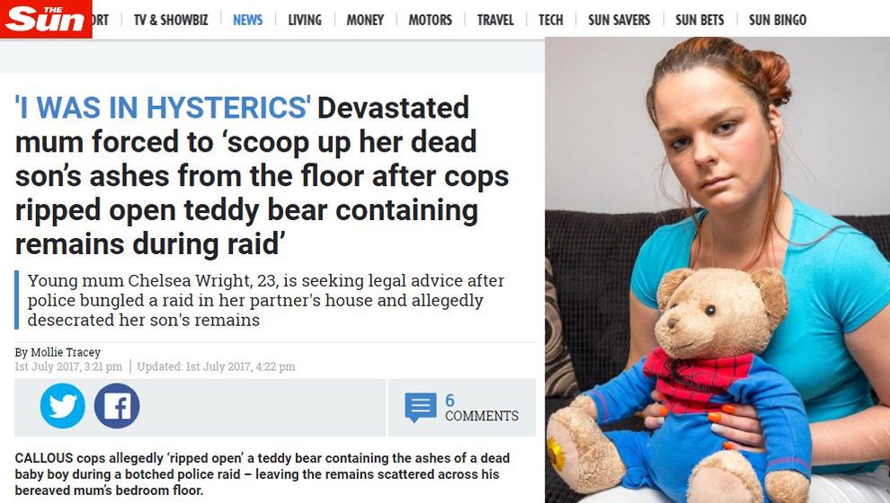 La polizia entra in casa sua cercando un pc rubato e nel perquisire le stanze getta a terra le ceneri del figlio morto. Chelsea Wright, 23 anni, ha raccontato al Sun, di essersi trovata in terra, in lacrime, mentre raccoglieva le ceneri del figlio morto prima di compiere un anno. La giovane madre ha raccontato di aver visto i poliziotti entrare con un mandato di perquisizione visto che sospettavano che in casa poteva avere un pc rubato. Nel cercare la merce hanno gettato a terra l’orsacchiotto un cui erano riposte le ceneri del bimbo scomparso spargendole in terra senza preoccuparsi nemmeno di chiedere scusa. “Non riesco a capire come possano essere stati così senza cuore” ha detto la donna. “Ho avuto una crisi isterica, mi sono chinata a raccogliere le ceneri, ma è stato impossibile”. Chelsea ha ammesso di aver portato sempre con sé l’orsacchiotto perché era come se il figlio fosse con lei, in ogni occasione. Oggi la donna ha deciso di raccontare quello che è successo e ha lanciato una petizione perché venga fatta giustizia e i colpevoli di un gesto tanto orribile siano puniti.