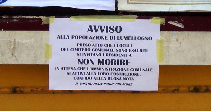 La curiosa vicenda si svolge a Lumellogno dove negli ultimi giorni sono apparsi dei cartelli che recitano: “Avviso alla popolazione di Lumellogno: preso atto che i loculi del cimitero comunale sono esauriti, si invitano i residenti a non morire in attesa che l’amministrazione comunale si attivi alla loro costruzione”. Firmato: “il vostro buon padre creatore”.