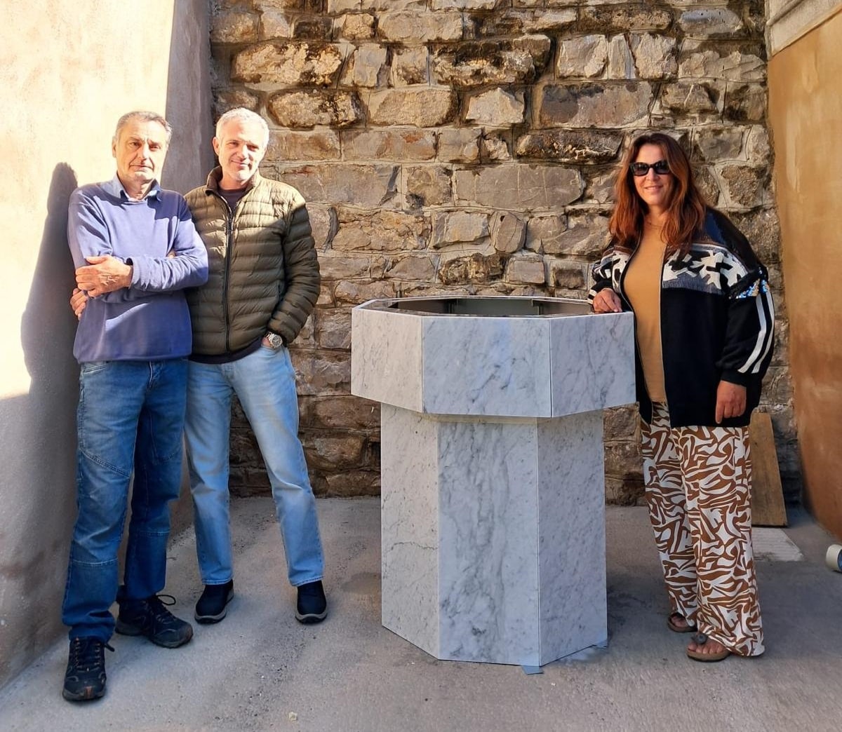 Hanno costruito la struttura in lamiera zincata e l’hanno rivestita in marmo bianco di Carrara, noto per eleganza e durata.