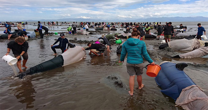 È uno dei fenomeni di spiaggiamento più grandi che si siano registrati quello che è avvenuto in Nuova Zelanda, sulle bellissime spiagge della Golden Bay, dove centinaia di esemplari di balena pilota si sono arenati e dove già 300 sono morti mentre i volontari accorsi cercano disperatamente di salvare quelli ancora in vita.