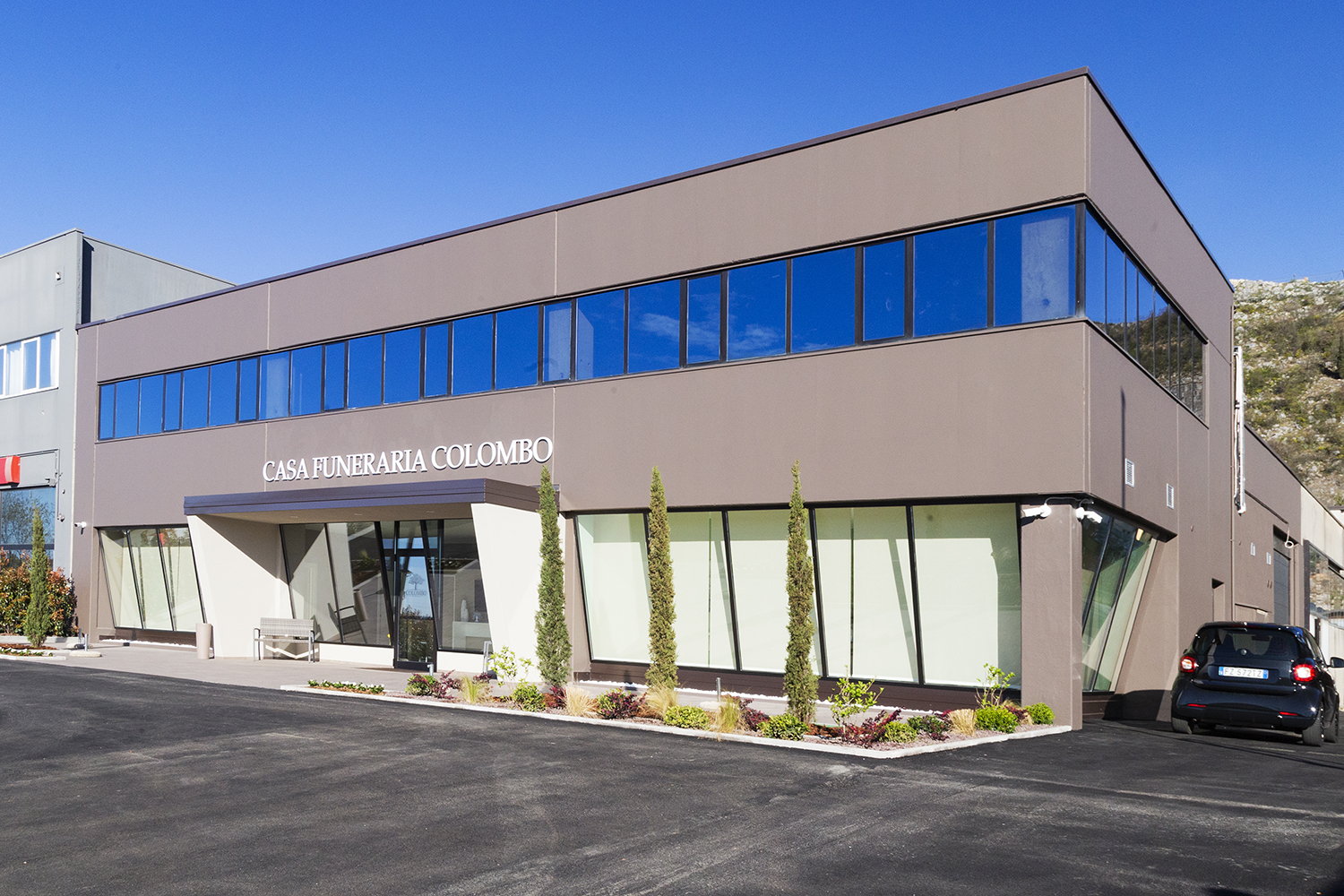 Tra le più recenti realizzazioni, spicca la Casa Funeraria delle Onoranze Funebri Colombo, inaugurata a Paitone lungo la direttrice che collega Brescia a Salò sul lago di Garda. Il progetto, sviluppato dallo studio Architettura+ di Brescia, ha trasformato un locale di 400 mq, inizialmente adibito a deposito di materiale elettrico, in una struttura accogliente, caratterizzata da un’elegante e discreta immagine.