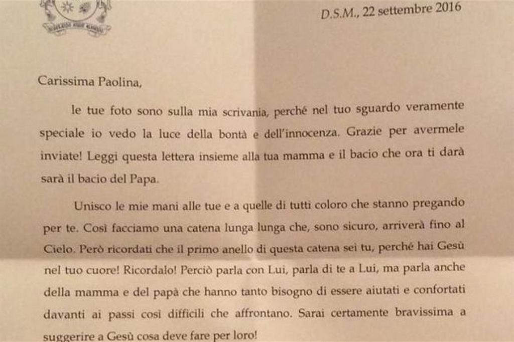 Carissima Paolina, le tue foto sono sulla mia scrivania, perché nel tuo sguardo veramente speciale io vedo la luce della bontà e dell’innocenza. Grazie per avermele inviate!“. Inizia così una lettera indirizzata il 22 settembre da Papa Francesco a una bambina gravemente malata, resa nota nei giorni scorsi in occasione del suo funerale.