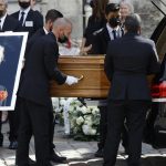 All’indomani dell’omaggio nazionale al mostro sacro del cinema francese, Jean-Paul Belmondo, la famiglia e gli amici più cari, tra cui l’attore Alain Delon, si sono riuniti per i funerali in forma privata nella chiesa di Saint-Germain-des-Près, la più antica di Parigi. L’arrivo del feretro sulla piazza antistante l’antica abbazia benedettina nel cuore della rive gauche parigina è stato accolto dall’applauso di centinaia di persone che lo attendevano dietro alle barriere protettive allestite intorno all’edificio. Alain Delon, a lungo presentato a torto come rivale di Belmondo, è apparso sorridente, con una stampella, salutato dalla folla che gridava il suo nome dinanzi a Saint-Germain.