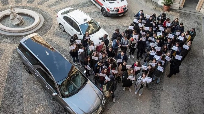 Cosa ci fanno un taxi, un’ambulanza e un carro funebre – sì, proprio quello – nel cortile di Palazzo Lascaris, sede del Consiglio regionale del Piemonte? Nessuna emergenza. Semmai, la rappresentazione plastica della sicurezza stradale in tutte le sue declinazioni, compresa la più estrema, oggetto dell’iniziativa «deciditucometornareacasasicuro è morto» rivolta agli studenti. E visto che, come è stato ampiamente dimostrato negli anni, snocciolare dati e cifre non basta – anzi: talora annoia -, si è deciso di puntare su qualcosa di più. E di diverso.