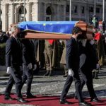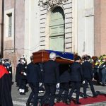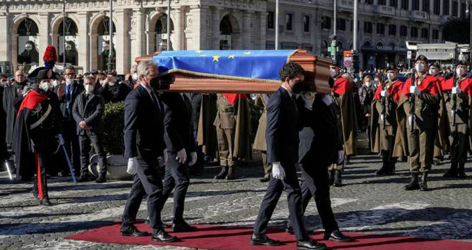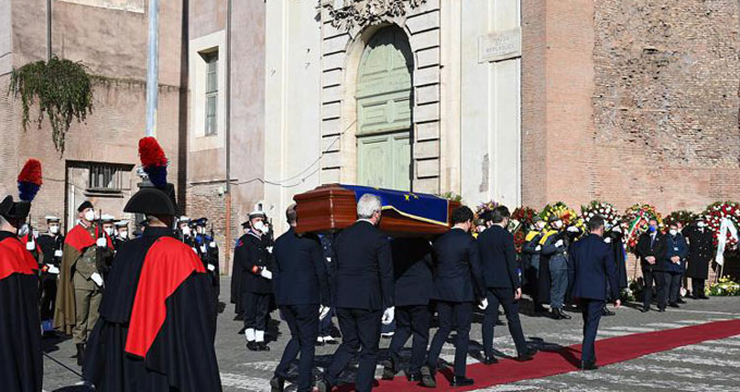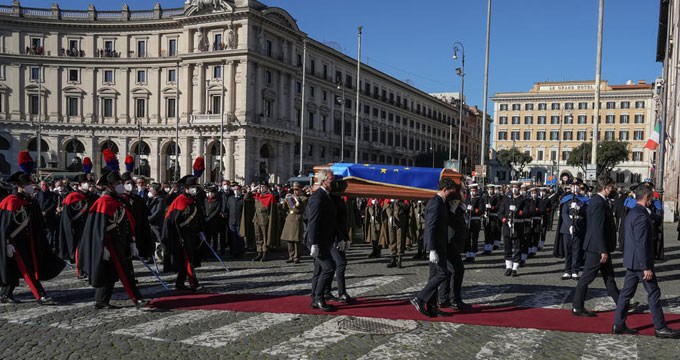La bara, arrivata dal Campidoglio avvolta dalla bandiera europea, è stata accolta dal picchetto d’onore. Ai funerali partecipano le più alte cariche dello Stato e delle istituzioni Ue. Già in chiesa la moglie Alessandra Vittorini e i figli Giulio e Livia, la presidente della Commissione Europea Ursula von der Leyen e il presidente del Consiglio Europeo Charles Michel, il ministero degli esteri, Luigi Di Maio, il premier Mario Draghi e il Presidente della Repubblica Sergio Mattarella. Ma anche molti ministri del governo e il premier spagnolo Pedro Sanchez.