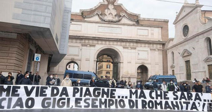 A mezzogiorno il feretro è arrivato alla Chiesa degli Artisti in piazza del Popolo. In chiesa sono entrati Fiorello, Bruno Conti, Guzzanti, Maurizio Mattioli, Enrico Vanzina. “Me viè da piagne… Ma che sarà… Ciao Gigi, esempio di romanità”. Questo il lungo striscione affisso dai romani a Piazza del Popolo. Accanto, anche una bandiera della Roma, squadra di cui Gigi Proietti era tifoso.