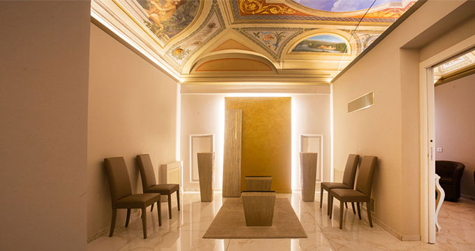 In effetti, la Casa Funeraria è alloggiata al piano terra di uno storico palazzo settecentesco, andando a occupare gli spazi limitrofi alla sede dell’Impresa.