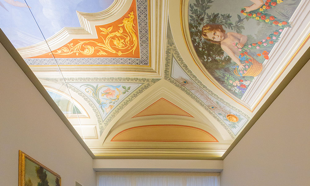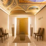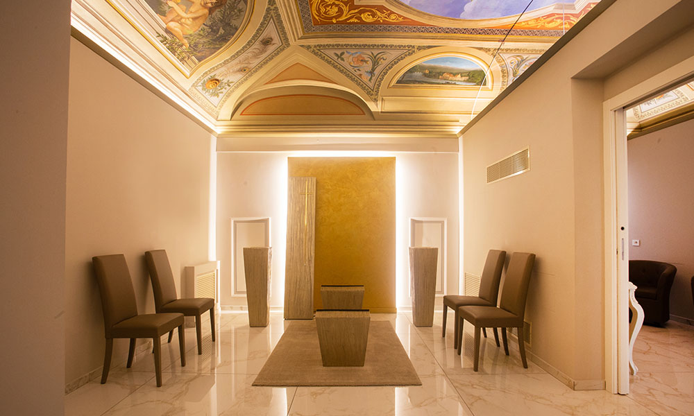 “È stata una bella sfida in quanto il contesto era abbastanza significativo”, spiegano gli architetti Tiziana Gaglione e Luca Brunori dello studio Architettura +. “Un grande soffitto affrescato e l’altro con volto a botte ribassato sono stati il grande valore aggiunto delle due sale con antisala per la celebrazione del lutto.